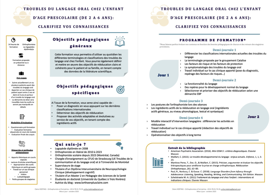 Depuis 2021, je propose une formation de 2 jours (ou 4 demi-journées à distance) sur les troubles du langage oral chez l'enfant d'âge préscolaire. Toutes les informations sont ci-dessous.